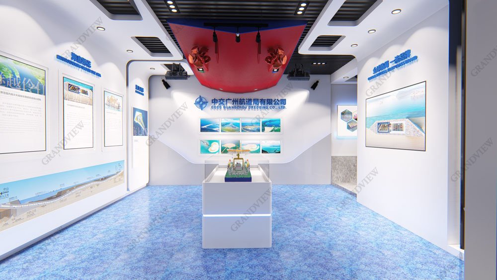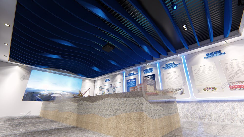 根據(jù)廣航局在深中通道建設(shè)中負責的海底基槽清淤的施工內(nèi)容,及廣航局的海上業(yè)務(wù)特點,廣航局展廳在設(shè)計時采用了大量的海洋元素。展廳圓弧形的設(shè)計來自船舶頭尾的弧形,線條優(yōu)美簡約,展廳的地板由藍色和黃褐色的地基展示,吊頂則以藍色的波紋展現(xiàn),海面海下場景一應(yīng)俱全,讓人仿佛置身于大海之中,與廣航局的業(yè)務(wù)范疇,企業(yè)理念相契合。
