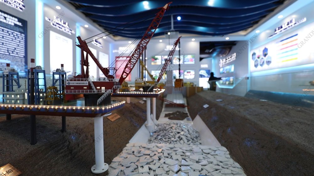 6.7×1.7米的沙盤模型展示的是基槽清淤的施工流程,制作精良,邊坡比經(jīng)過了嚴密的計算,模型的仿真度和還原度極高,力求為大家呈現(xiàn)出一個完美的視覺空間。模型旁邊墻上的施工流程圖依次對照模型里面的船舶進行施工流程解說。船舶呈動態(tài)模式,可模擬施工動作,技術(shù)先進,業(yè)內(nèi)少見。