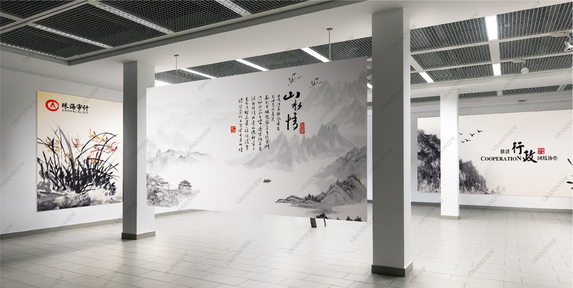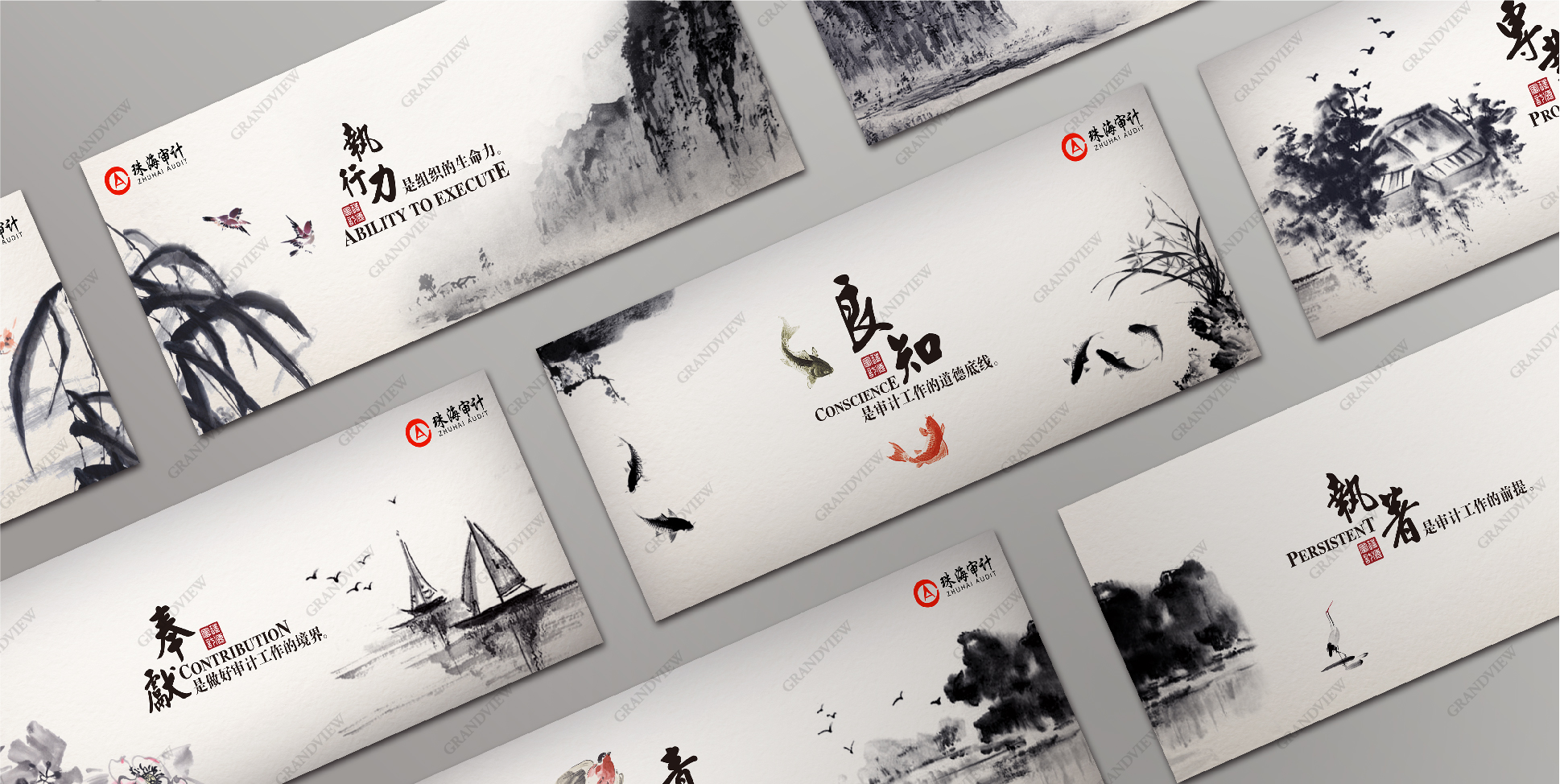 當(dāng)看到一幅極具人文古韻的水墨畫時(shí),為珠海市審計(jì)局與藝術(shù)聯(lián)結(jié)點(diǎn)苦苦尋覓無果的廣角設(shè)計(jì)師茅塞頓開。于是著力于對(duì)民族的審美意識(shí)和審美心理的把握,站在珠海市審計(jì)局的角度進(jìn)行綜合設(shè)計(jì)。