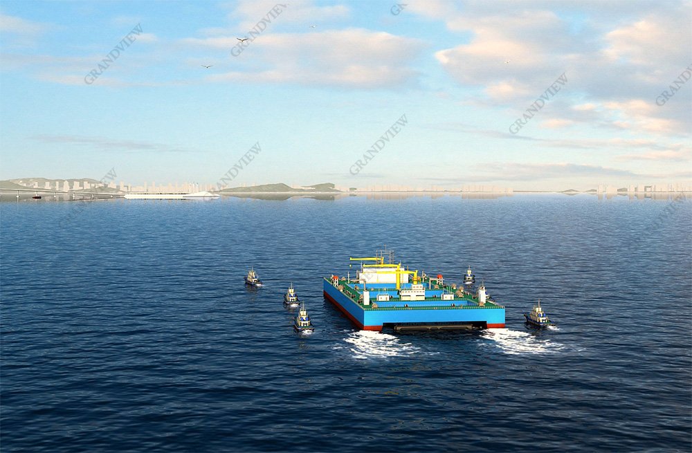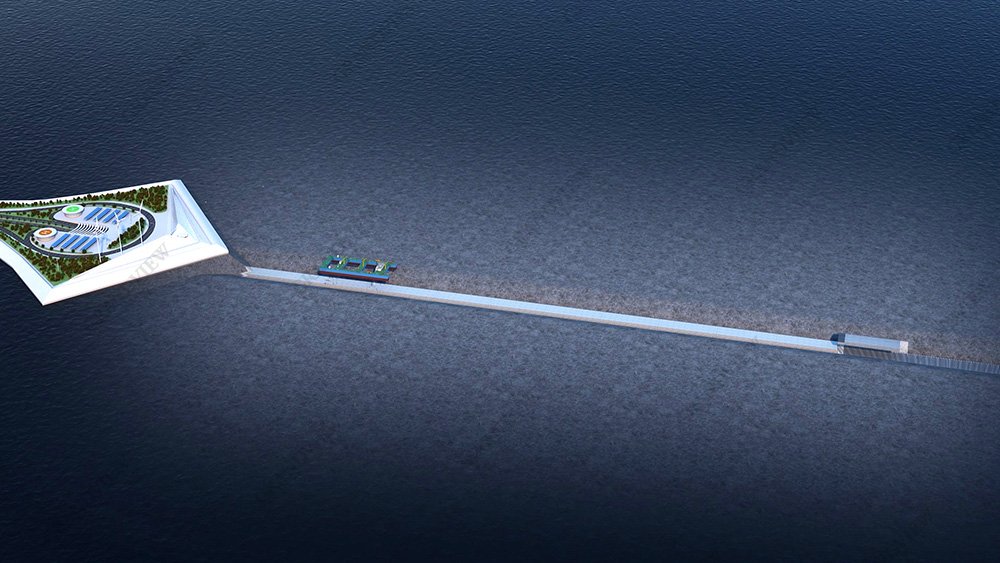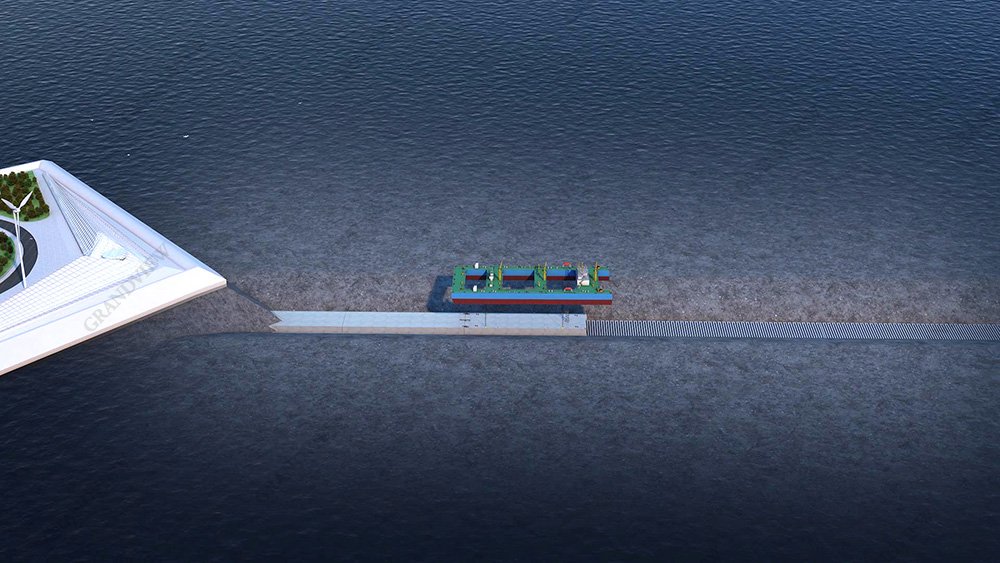 在畫面的呈現(xiàn)上,我們采用圖層透明羽化疊加手法:通過分別渲染正常海面以及只有海床的效果,通過后期處理,透明疊加的方式,柔和過渡沉管工程在水下的形態(tài)。